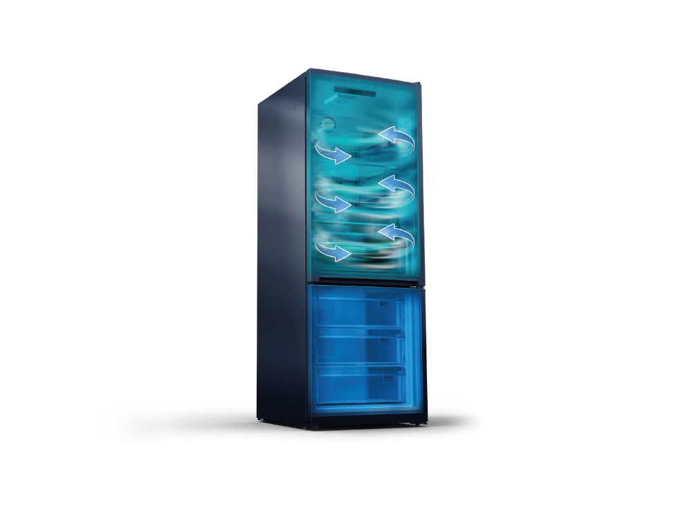 A különálló NeoFrost™ hűtési rendszer biztosítja a jegesedés mentes hűtést és az élelmiszerek tartósítását anélkül, hogy a szagok keverednének a hűtőszekrény és a fagyasztó között. Az AeroFlow™ technológia gyengéd légkeringtetésével kombinálva, amely biztosítja a levegő hőmérsékletének egyenletes eloszlását a hűtőtérben, hosszabb ideig frissen tartja az élelmiszereket, anélkül, hogy azok kiszáradnának és segít az ízek és a tápanyagok megőrzésében is. Ráadásul a hűtő hátsó falán nem képződnek vízcseppek a fagyasztóban pedig nem képződik jég így azt nem kell leolvasztania.